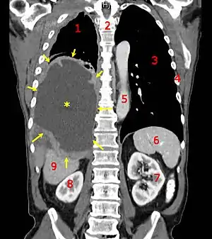 | A coronal CT scan showing a malignant mesothelioma Legend: → tumor ←, ✱ central pleural effusion, 1 & 3 lungs, 2 spine, 4 ribs, 5 aorta, 6 spleen, 7 & 8 kidneys, 9 liver. | |