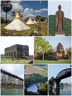 ![]() ကန်ချနဘူရီပြည်နယ်အထွေထွေ (ထိပ်ကနေလက်ယာရစ်) ဘုရားစေတီ,မေတ္တာရှင်ဗုဒ္ဓရုပ်ပွားတော်, ရှေဟောင်းမြို့တော် ရဲတိုက်, မြစ်ကွိုင်းပေါ်တံတား, စီနခရင်လ်, မွန်တံတား, နစ်မြုပ်နေသောဘုန်းတော်ကြီးကျောင်း ဝင်ကမြို့ | |||