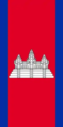 | ဒီဇိုင်း | Three horizontal bands of blue, red (double width) and blue, with a depiction of Angkor Wat in white centred on the red band. |