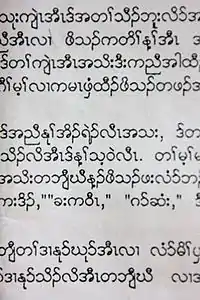 အမေရိကန် သာသနာပြု ဒေါက်တာ ဂျွန်နသန်ဝိတ် က ခရစ်နှစ် ၁၈၃၂ ခုနှစ် တွင် မြန်မာ အက္ခရာ ကို မှီး၍ တီထွင် ရေးသားခဲ့သည်။ ဗျည်းအက္ခရာ (၂၅) လုံးနှင့် သရ (၉)လုံး ပါဝင်သည်။