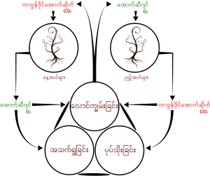 အပင်များသည် နေရောင်ခြည်ဖြင့် အစာချက်လုပ်ရာတွင် ကာဗွန်ဒိုင်အောက်ဆိုဒ်ကို ကုန်ကြမ်းအဖြစ် သုံးသည်။ အပိုပစ္စည်းအဖြစ် သတ္တဝါများ အသက်ရှူရာတွင် လိုအပ်သည့် အောက်စီဂျင်ဓာတ်ငွေ့ကို ထုတ်လွှတ်သည်။ အရာဝတ္ထုများ မီးလောင်ကျွမ်းသည့်အခါ သို့မဟုတ် လူအပါအဝင် သတ္တဝါများ အသက်ရှူသည့်အခါ CO2 ဓာတ်ငွေ့ကို ထုတ်လွှတ်သည်။
