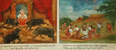 - (၁) အရပ်လေးမျက်နှာမှ လေးကောင်သော နွားလား ဥသဘတို့သည် လာလတ်၍ မင်းရင်ပြင်၌ ဝှေ့မည်ဟု တွန်မြည် ကြုံးဝါးလျက် မဝှေ့ပဲသာလျှင် ဖဲလေကုန်သည်ဟု မြင်မက်ပါသည်။