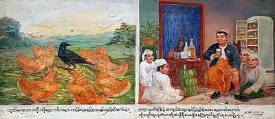 - (၁၅) မည်းနက် ရုပ်သွင်၊ အဆင်း ဆိုးဝါးသော ကျီးတို့ကို ရွှေ၏ အဆင်းနှင့် တူသော ရွှေဟင်္သာ တို့က ခြံရံ နေကြသည်ကို မြင်မက်ပါသည်။