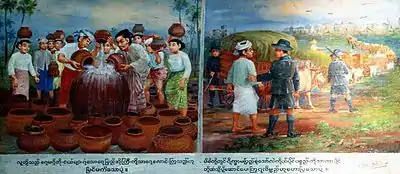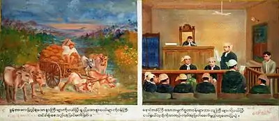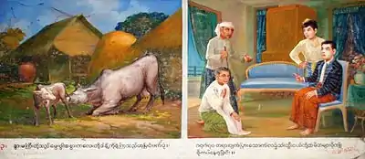 - (၆) အဖိုးတသိန်း ထိုက်သော ရွှေခွက်ကို မြေခွေးဖိုအား ကျင်ငယ်စွန့်ရန် ပေး၏။ မြေခွေးလည်း ထိုရွှေခွက်၌ ကျင်ငယ်စွန့်သည်ဟု မြင်မက်ပါသည်။