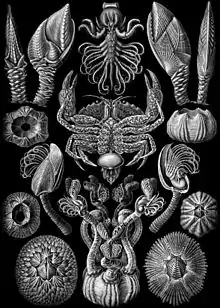 | "Cirripedia" from Ernst Haeckel's Kunstformen der Natur (1904). The crab at the centre is nursing the externa of the parasitic cirripede Sacculina | |
