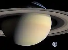![]() ကမ္ဘာဂြိုဟ်နှင့် စနေဂြိုဟ်ကို အရွယ်အစားခြင်း ယှဉ်ပြထားသောပုံ |