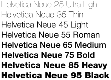 Helvetica Neue စာလုံးပုံစံ၏ စာလုံးအထူအပါးအမျိုးမျိုး