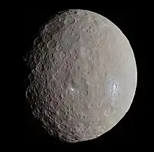 ![]() A view of Ceres in natural color, pictured by the Dawn spacecraft in May 2015.[lower-alpha 1] | |||||||||