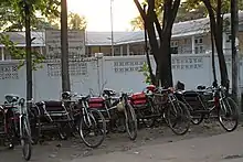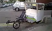 - Oxford English Dictionary : cycle rickshaw (or) bicycle rickshaw is a three-wheeled bicycle for public hire with a covered seat for passengers behind the driver