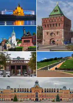 ![]() Clockwise: The Kremlin, Chkalov Stairs, Minin and Pozharsky Square, the State Bank in en:Bolshaya Pokrovskaya Street, the Fair, Saint Alexander Nevsky cathedral. | |||