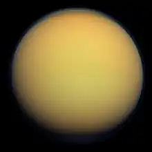 ![]() Titan in natural color. The thick atmosphere is orange due to a dense organonitrogen haze. | |