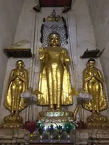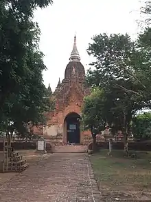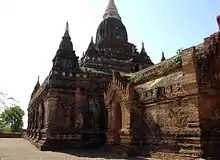 အတန်ငယ်ကျယ်ဝန်းသော တံတိုင်းအတွင်း၌ တည်ထားသည်။ အမိုးများသည် ဆင်ခြေလျှောဖြစ်၍ ယင်းအထက်၌ ပစ္စယာများ ဆင့်ထားသည်။ ပစ္စယာထောင့်များ၌ စေတီငယ်များ ရှိသည်။ အထက်ပစ္စယာအပေါ်တွင် ကွမ်းတောင်နှင့် အထွက်တင်ထားသည်။ ပုံစံမှာ အာနန္ဒာလိုဏ်ဂူဘုရားနှင့် အနည်းငယ်ဆင်သည်။