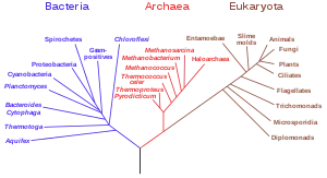 ![]() အာရ်အဲန်အေ(RNA) မျိုးရိုးဗီဇ(gene)ကွဲပြားမှုအပေါ်မှတစ်ဆင့် မှန်းဆထားသော ဘက်တီးရီးယား (Bacteria)၊ အာခီးယာ (Archaea)၊ ယူကဲရီးယုတ်တာ (Eukaryota)ဟု ခေါ်သော အဓိကအကိုင်း ၃-ကိုင်းပါ မြစ်တွယ်သစ်ပင်ကိုင်းဖြာသရုပ်ပြပုံ (rooted tree diagram) |
