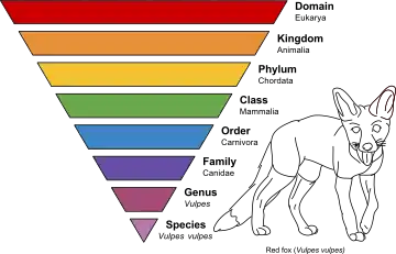 ![]() ဇီဝဗေဒဆိုင်ရာ မျိုးရိုးခွဲခြားခြင်း၌ အဓိကအဆင့်ကြီး (taxonomic ranks) ၈-ခု ရှိသည်။ သက်ရှိ (Life) အုပ်စုအောက်တွင် နယ်ပယ် (domain)များရှိပြီး၊ ၎င်းတို့ကို အခြားအုပ်စုငယ်များသို့ ထပ်ဆင့်ခွဲထားသည်။ အခြားအဆင့်ခွဲငယ်များကို ဤနေရာတွင် မပြပါ။ |