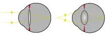 မျက်လုံး အရှေ့ပိုင်းရှိ မှန်ဘီလူး သည် ကင်မရာ မှန်ဘီလူး ကဲ့သို့ ဖြစ်သည်။ မျက်လုံး အတွင်းပိုင်း ကြွက်သား ကို ကြုံ့ခြင်း ကြွခြင်း အားဖြင့် မှန်ဘီလူး ကို ခုံးစေ ပြားစေ နှိင်သည်။ လူအိုများတွင် ၎င်းကို ကောင်းစွာ မလုပ်နိုင်တော့ပေ။ လူများစု သည် မွေးစကတည်းက သော်လည်းကောင်း၊ နောက်ပိုင်းသော်လည်းကောင်း အမြင်ချို့တဲ့၍ မျက်မှန် သို့မဟုတ် မျက်ကပ်မှန် ကို လိုအပ်နိုင်သည်။