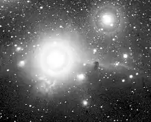 ![]() The entire neighborhood of the nebula. The reflection nebula NGC 2023 is in the bottom left corner and the nebula itself near the center, in the shape of the head of a horse. | |