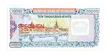 | ၁၀,၀၀၀ ကျပ် [25] | ၁၅၀ × ၇၀ မီလီမီတာ | အပြာ၊ အနီ၊ ခရမ်းနု၊ အစိမ်း၊ အညို၊ အဝါ | ပြောင်းလဲထားသော မြန်မာနိုင်ငံတော် အထိမ်းအမှတ်တံဆိပ် (မူလ နိုင်ငံတော် အထိမ်းအမှတ်တံဆိပ်ရှိ ခြင်္သေ့၊ ကြယ်များအစား ကြာပန်း၊ ဆင်တစ်စုံ ပါဝင်) | မန္တလေးနန်းတော် ကျုံးမြို့ရိုး | တန်ဖိုးအပေါ် ကြာပန်းပုံ | ၁၅ ဇွန် ၂၀၁၂ | Value above watermark |