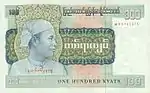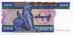 ၁၀၀ ကျပ် | ၁၆၀ × ၉၀ မီလီမီတာ | လိမ္မော် | ဒေါင်းပုံနှင့် "ကျပ်တရာ" ကို မြန်မာဘာသာဖြင့် ရေးထားပြီး နောက်ကျောတွင် နေထွက်ပုံ ပါရှိသည်။ | ||||