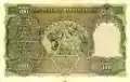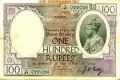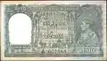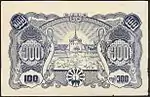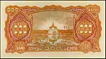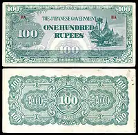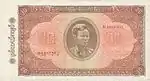 ၁၀၀ ကျပ် | ၁၅၅ × ၉၅ မီလီမီတာ | နက်ပြာ | ဒေါင်းပုံ၊ "ကျပ်တရာ" ကို "၁၀၀" ဂဏန်းပေါ်မှ မြန်မာဘာသာဖြင့် ရေးထားပြီး ဘေးတွင် နိုင်ငံတော်အဓိပတိ ဒေါက်တာဘမော်ပုံ ပါရှိသည်။ | အလယ်တွင် မန္တလေး တော်ဝင်နန်းတော်ပုံအား နဂါးပုံဖြင့် ဝန်းရံထားသည်။ ဘယ်နှင့်ညာတို့တွင် "၁၀၀" ကို မြန်မာဂဏန်းဖြင့် ရေးထားသည်။ | နိုင်ငံတော်အဓိပတိ ဒေါက်တာဘမော်၏ ပုံ | ၁၉၄၅ | |