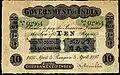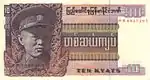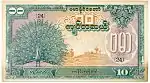 ၁၀ ကျပ် | ၁၄၆ × ၈၄ မီလီမီတာ | အစိမ်း | ဒေါင်းပုံနှင့် "ကျပ်တဆယ်" ကို မြန်မာဘာသာဖြင့် ရေးထားပြီး နောက်ကျောတွင် နေထွက်ပုံ ပါရှိသည်။ | ||||