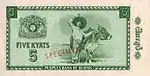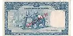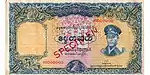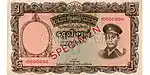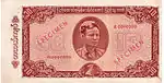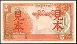 ၅ ကျပ် | ၁၃၀ × ၇၂ မီလီမီတာ | အနီ | ဒေါင်းပုံနှင့် "ကျပ်ငါးကျပ်" ကို မြန်မာဘာသာဖြင့် ရေးထားပြီး နောက်ကျောတွင် နေထွက်ပုံ ပါရှိသည်။ | |||||