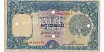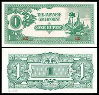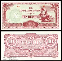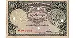 ၁ ကျပ် | ၁၀၉ × ၆၃ မီလီမီတာ | အပြာ | ဒေါင်းပုံနှင့် "ကျပ်တကျပ်" ကို မြန်မာဘာသာဖြင့် ရေးထားပြီး နောက်ကျောတွင် နေထွက်ပုံ ပါရှိသည်။ | မန္တလေး တော်ဝင်နန်းတော် | "ဗမာ" | ၁၉၄၄ | |