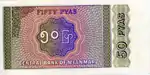 | ၅၀ ပြား | ၁၁၀ × ၅၅ မီလီမီတာ | ရှေ့ - ခရမ်းနုရောင်နှင့် လိမ္မော်ရောင် နောက်ကျော - အရောင်စုံ | စောင်းကောက် | Guilloché pattern | "BCM" | ၂၇ မတ် ၁၉၉၄ | |