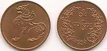 | [4] | ၁၀ ပြား | ၂၀.၄ မီလီမီတာ | ကြေးဝါ | စပါးပင်၊ "မြန်မာနိုင်ငံတော် ဗဟိုဘဏ်" | တန်ဖိုး (မြန်မာဂဏန်းဖြင့်) | ၁၉၉၁ | ||