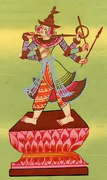 ဝဲယာနှစ်ဖက်က လက်အုပ်ချီ၍ရင်မှာကပ် ထားသည်။ ကျန်လက်ဝဲနှစ်ဖက်ကတုတ်နှင့်သိုင်း၊ ယာလက်နှစ်ဖက်က ဓားနှင့်လှံကိုင်ထားသည်။ ဦးခေါင်းတွင်မောက်တိုဆောင်း၍