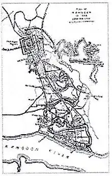 ကုန်းဘောင်မင်းဆက် (၇) ဆက်မြောက်မင်းဖြစ်သော ဘကြီးတော်ဘုရား လက်ထက် ပထမ အင်္ဂလိပ်-မြန်မာ စစ်ပွဲ (၁၈၂၄ - ၂၆) တွင် ဗြိတိသျှတို့သည် ရန်ကုန်မြို့ကို အောင်မြင်စွာ သိမ်းပိုက်ခဲ့သော်လည်း၊ စစ်ပြီးသည့်နောက် ရန္တပိုစာချုပ် အရ ရန်ကုန်မြို့ကို မြန်မာတို့လက်ထဲ ပြန်လည်လွှဲပြောင်းပေးခဲ့သည်။ မြန်မာဘုရင် သာယာဝတီမင်း လက်ထက် ၁၈၄၁ ခုနှစ်တွင် ရန်ကုန်မြို့ သည် မီးသင့်ပြီး ပျက်စီးခဲ့သည်။