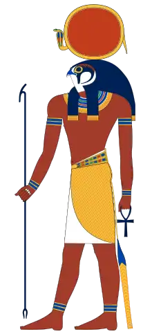 ![]() နေနတ်ဘုရား 'ရား'၏ ပုံစံများစွာမှတစ်ခုတွင် ၎င်း၌ သိမ်းငှက်ခေါင်းပါရှိပြီး အတွင်း၌မြွေဟောက်ပါရှိသော နေဝန်းအဝိုင်းတစ်ခုသည် ဦးခေါင်းထက်တွင် တည်ရှိ၏။ | |||||||||||
