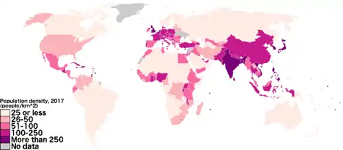 | • | ကမ္ဘာ (ကုန်းမြေချည်းသာ၊ အန္တာတိကတိုက် မပါဝင်ပေ။) | ၁၃၄,၉၄၀,၀၀၀ | ၅၂,၁၀၀,၀၀၀ | ၇၈၁၂၆၀၀၈၀၀ | ၅၈ | ၁၅၀ | ဖေဖော်ဝါရီ ၃, ၂၀၂၁ | USCB's world population clock |