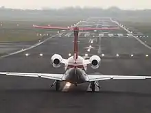 - Runway centerline lighting system (RCLS) – lights embedded into the surface of the runway at ၅၀ ပေ (၁၅ မီတာ) intervals along the runway centerline on some precision instrument runways. White except the last ၉၀၀ မီတာ (၃,၀၀၀ ပေ): alternate white and red for next ၆၀၀ မီတာ (၁,၉၆၉ ပေ) and red for last ၃၀၀ မီတာ (၉၈၄ ပေ).