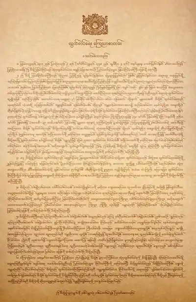 | “ | ဂြီသက္ကရာဇ် တစ်ထောင့်သုံးရာကိုးခုနှစ်၊ ပြာသိုလဆုတ် (၉)ရက်၊ တနင်္ဂနွေနေ့အား ဤငါတို့မြန်မာပြည် လုံးဝလွတ်လပ်သော အချုပ် အခြာအာဏာပိုင် ပြည်ထောင်စုသမ္မတနိုင်ငံတော်ကြီးအဖြစ် ကောင်းစွာရောက်သတည်း။ | ” |