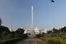 ![]() ရန်ကုန်မြို့ မဟာဗန္ဓုလပန်းခြံရှိ လွတ်လပ်ရေးကျောက်တိုင်။ | |