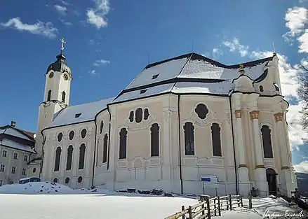 ဘုရားကျောင်း ဆောက်လုပ်ခြင်းကို ၁၇၄၅ မှ ၁၇၅၄ အထိ တည်ဆောက်ခဲ့ပြီး အတွင်းပိုင်းအား ဝက်ဆိုဘရန်းနာ စကူးလ် ၏ ပုံစံ အင်္ဂတေပန်းချီများ နှင့် သရွတ်နုပန်းချီများဖြင့် တန်ဆာဆင်ထားသည်။ "ဘုရားကျောင်း တစ်ခုလုံးတွင် ပြုလုပ်ထားသမျှသည် သဘာဝလွန်များကို မြင်သာအောင် ပြုလုပ်ထားသည်။ ပန်းပုရုပ်များနှင့် နံရံဆေးရေးပန်းချီများ ပေါင်းစပ်ပြီး အနန္တတန်ခိုးတော်တို့အား မြင်သာသည့် ပုံစံဖြင့် ပြသထားသည်" ဟု ဆိုသည်။ [1]