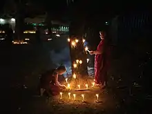 ရှို့လွှတ်မြဲ မီးမျိုးစုံများကို မဟာလောကမာရဇိန်ဘုရား၊ မာန်အောင်ရတနာဘုရားနှစ်ဆူမှာ ခွဲဝေရှို့ လွှတ်ပူဇော် ရသည်။ နှစ်စဉ်ထွန်းလင်းပူဇော်မြဲ တစ်ဆယ့်ခြောက်ဌာန ပြင် အရှင်နှစ်ပါး နံတော်သင့် ဘုရားများပါ စုစုတစ် ဆယ့် ရှစ်ဌာနဘုရားများမှာ မီးစောင်းတန်း ထွန်းလင်းပူ ဇော်ရာ မှူးကြီးမတ်ကြီးတို့နှင့် မှူးတော်မတ်တော်အရာရှိ တို့ ခွဲဝေသွားရောက်ကြီးကြပ် ပွဲသဘင်ခင်းကျင်း ထွန်း လင်းပူဇော်ရသည်။ တစ်ဆယ့်ရှစ်ဌာနများသို့ မီးထွန်းလင်း လမ်းလျှောက် တီးမှုတ်ထမ်းရွက်စေရန် သေနတ်၊ အမြောက်၊ ဝင်း၊ ဒိုင်း၊ လှေ၊ ဘောင်၊ ရပ်ကွက်များက အသီးသီးထွက်သည့် အိုးစည်၊ ဒိုးပတ်၊ ပုံထောင်၊ မောင်း၊ တီးမှုတ်သူတို့ကို တစ်ကိုယ်လျှင် ငွေဒင်္ဂါးငါးပြားကျ သနားတော်မူသည်။ ယင်းသည့်နေ့ ရွှေနန်းတော် မြေနန်း တော်တောင်ဘက်တွင် တစ်ဆယ့်ခြောက်ဌာနဝင်္ကပါ၊ စိကြ နန္ဒာဝင်္ကပါများကို လုပ်ဆောင်ရသည်။ လပြည့်ကျော် ခုနှစ်ရက်န့ မြေနန်းတော်တောင်ဘက် သောဠ သဝင်္ကပါ ကို ပြီးပြေအောင်လုပ်ဆာင်၍ မီးထွန်းလင်းစေပြီးလျှင် အရှင်နှစ်ပါးထွက်စံတော်သည်။