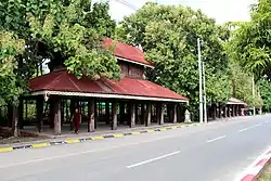 သစ်သားတိုင်လုံးများဖြင့် တည်ဆောက်ထားသော အမိုးနှစ်ထပ် လည်ပေါ်တစ်ဆင့်ခံထားဝယ်ဆောင်ပုံစံ အဆောက်အအုံမျိုးဖြစ်သည်။ အဆောက်အအုံကို ထုပ်စွပ်လျောက်စွပ်စနစ်ဖြင့် တည်ဆောက်ထားသည်။ ယခင်က အမွှမ်းပန်းများ အမိုးအကာများရှိခဲ့သော်လည်း ယခုအခါ၌မရှိတော့ပါ။