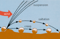 ပွယောင်းသော သဲမြေမျက်နှာပြင်များပေါ်တွင် အားပြင်းသောလေ တိုက်ခတ်ဖြတ်သန်းချိန်တွင် သဲမုန်များသည် အစပိုင်းတွင် တုန်ခါလာပြီး နောက် ခုန်ပျံလာကြခြင်းများတိုးပွားလာသည်။ ထိုသို့ ထိန်းချုက်မှု လျော့လျဲလာပြီး ပျက်စီးလာသည့် မြေပြင်အား ထပ်ကာတလဲလဲ တိုက်ခတ်လာခြင်းသည် အမှုန်ငယ်များအား ခုန်ပျံခြင်းဖြင့် အဝေးသို့ရောက်ရှိသွားစေရန် အစတင်လုပ်ဆောင်သည်။ လေ၏အပေါ်ပိုင်းတွင် အလွန်သေးငယ်သောအမှုန်များသည် ဆိုင်းငံ့နေရန်ဖြစ်လာပြီး ထိုနေရာမှ သဲမှုန်များအား တွားသွားခြင်း၊ ခုန်ပျံခြင်းနှင့် လွင့်မျောခြင်းဟူသည့်အဆင့်များဖြင့် ရွေ့လျားရန် တန်းစီနေသည့် ယန္တရားတစ်ခုဖြစ်စေသည်။