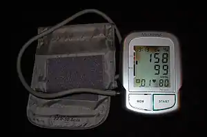 | အလိုအလျှောက်လက်မောင်း၌တိုင်းတာသော သွေးချိန်ကိရိယာ၊ အပေါ်သွေး 158 mmHg နှင့် အောက်သွေး 99 mmHg၊ နှလုံးခုံနှုန်း တစ်မိနစ် ၈၀ကြိမ်ကို ပြသနေခြင်း။ | |