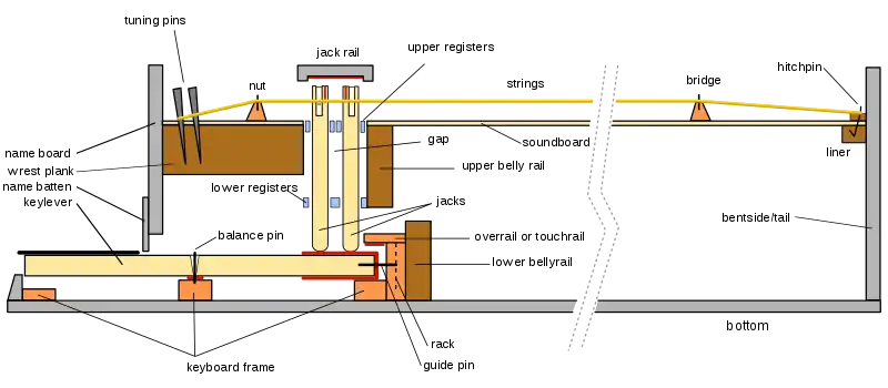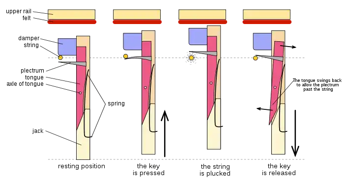 ဟာ့ပ်ဆီကော့ဒ်၏ ခလုတ်တစ်ခုကို နှိပ်လိုက်သောအခါ ထိုခလုတ်၏အခြားတစ်ဖက်တွင် ဂျက်ခ် (jack) ကိုမစေသည်။ ယင်းဂျက်တွင် ပလက်ထရမ် (plectrum) မည်သော ကြိုးကိုတုန်ခါစေမည့် အတက်ကလေးပါဝင်သည်။ ထိုအတက်သည် ဂျက်ခ်၏အပေါ်တက်လာမှုကြောင့် ကြိုးကိုထိရာ ကြိုးတုန်ခါမှုကြောင့် အသံဖြစ်ပေါ်လာသည်။ ခလုတ်ကိုလွှတ်လိုက်သောအခါ ဂျက်ခ်သည် အနည်းငယ်တိမ်းစောင်း၍ မူလနေရာသို့ ပြန်ရောက်သည်။ ထိုသို့တိမ်းစောင်းရခြင်းမှာ ပလက်ထရမ်ကိုကြိုးနှင့် နောက်ထပ်မထိစေရန်ဖြစ်သည်။ ဂျက်ခ်သည်မူလနေရာသို့ ပြန်ရောက်သောအခါ ဂျက်ခ်၌ပါဝင်သောဒမ်ပါ (Damper) သည် ကြိုး၏တုန်ခါမှုကိုရပ်တန့်စေသည်။