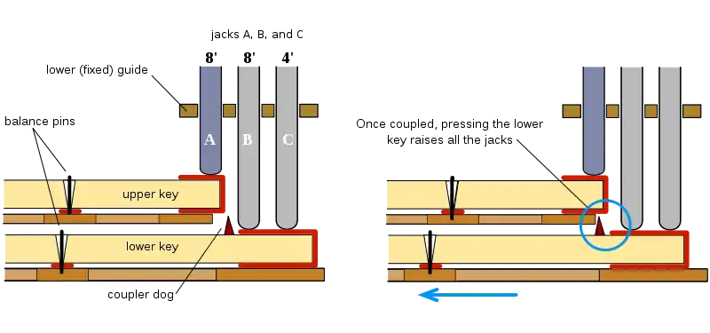 မန်နူအယ်တစ်ခုစီတွင် ကြိုးများသည် မတူညီသောကြောင့်ထွက်သောအသံသည်လည်း မတူကြပေ။ သို့ဖြစ်ရာ ထိုအသံနှစ်ခုကို ပေါင်းစပ်တီးခတ်နိုင်ရန်အတွက် coupling mechanism ခေါ် ပေါင်းစပ်ခြင်းစနစ်ကို ထည့်သွင်းပေးထားပါသည်။