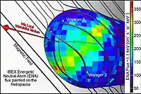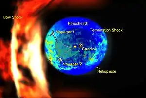 Beyond the heliopause, where the interstellar medium collides with the heliosphere, it was once thought there was a bow shock. However, data from the Interstellar Boundary Explorer suggests that the velocity of the Sun through the interstellar medium is too low for a bow shock to form.[5] Also, Cassini and IBEX data challenged the "heliotail" theory in 2009.[6][7] Voyager data led to a new theory that the heliosheath has "magnetic bubbles" and a stagnation zone.[8][9]