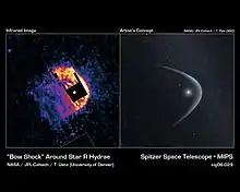 By 2012, it was determined the Sun has no bow shock.[5] Before then, it was hypothesized that the Sun had a bow shock produced in its travels within the interstellar medium (see image). The shock is named from its resemblance to the wake left by a ship's bow and is formed for similar reasons, though of plasma instead of water. Bow shocks will occur if the interstellar medium is moving supersonically "toward" the sun, since its solar wind moves "away" from the sun supersonically. When the interstellar wind hits the heliosphere it slows and creates a region of turbulence. NASA's Robert Nemiroff and Jerry Bonnell believed the solar bow shock occurred at about 230 AU[13]