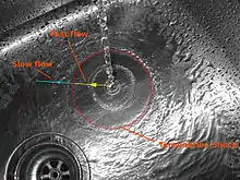 Other termination shocks can be seen in terrestrial systems; perhaps the easiest may be seen by simply running a water tap into a sink creating a hydraulic jump. Upon hitting the floor of the sink, the flowing water spreads out at a speed that is higher than the local wave speed, forming a disk of shallow, rapidly diverging flow (analogous to the tenuous, supersonic solar wind). Around the periphery of the disk, a shock front or wall of water forms; outside the shock front, the water moves slower than the local wave speed (analogous to the subsonic interstellar medium).