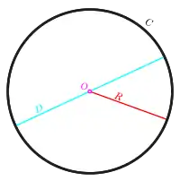 Circle with circumference C in black, diameter D in cyan, radius R in red, and center or origin O in magenta.