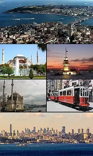 ![]() ထိပ်မှစ၍ လက်ယာရစ်: ဂါလာတာနှင့် ဆာရဂ်လီယိုပွိုင့်ကြားမှ သမိုင်းဝင်နေရာများ အပါအဝင် ရွှေဦးချို၏ မြင်ကွင်း၊ မေဒန် မျှော်စင်၊ ရှေးခေတ်ဟောင်း အောက်မေ့ဖွယ် ဓာတ်ရထားကို အစ်စတီကယ် ရိပ်သာလမ်း ပေါ်တွင် တွေ့ရစဉ်၊ လဲဗန့် စီးပွားရေး ဒေသနှင့် ဒိုမာဘာချီ နန်းတော်၊ အော်တာကွိုင်း ဗလီကို ဘော့စ်ဖိုးရပ်စ် တံတားရှေ့တွင် တွေ့ရပုံ၊ ဟာဂီယာ ဆိုဖီယာ ၏ မြင်ကွင်းပုံ | |