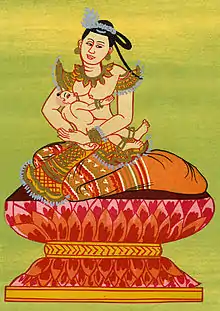 မိန်းမအသွင် နန်းဝတ်နန်းစားဖြင့် ဒူးထောက်ကာ ကလေးငယ်ကို ချော့မြူပိုက်ထွေးထားဟန် ထုလုပ်ကြသည်။[1]