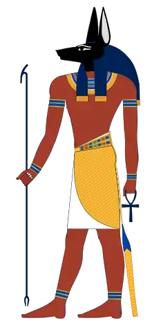 အနျူးဘစ်ကို ပြန်လည်ရှင်သန်ပေါက်ဖွားခြင်း၊ ဘဝ၊ နိုင်းမြစ်၏ မြေဆီဩဇာ၊ ဆေးရည်စိမ်အလောင်းများ၏ အရောင်ပြောင်းလဲခြင်း စသည်တို့ကိုကို ပုံဖော်နိုင်သောအရောင် အနက်ရောင်ဖြင့် သရုပ်ဖော်ကြသည်။ ခွေးခေါင်းပါရှိသော နောက်ထပ်အီဂျစ်နတ်ဘုရားဖြစ်သည့် ညီအကိုတော်စပ်သူ Wepwawet နတ်ဘုရားနှင့် ဆက်နွယ်ပတ်သက်သည်။ Wepwawet ကို မီးခိုးရောင် သို့ အဖြူရောင် အမွှေး/အရေပြား ဖြင့်သရုပ်ဖော်ကြသည်။ သမိုင်းပညာရှင်များက ဤပုံပန်းသဏ္ဍာနှစ်ခုသည် နောက်ဆုံး၌ပေါင်းစပ်သွားကြသည်ဟု ယူဆကြသည်။[6] ၎င်း၏ဇနီးမှာ ပန်ပေါ့ (Anput)နတ်ဘုရားမဖြစ်၍ သမီးမှာ မြွေနတ်ဘုရားမဖြစ်သော ကက်ဘက်ချက် (Kebechet)ဖြစ်သည်။