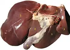 ![]() သိုးသည်း - (1) right lobe, (2) left lobe, (3) caudate lobe, (4) quadrate lobe, (5) hepatic artery and portal vein, (6) hepatic lymph nodes, (7) gall bladder. | |